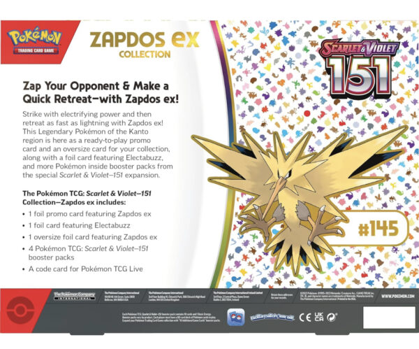 - Contains 4 Pokémon TCG: Scarlet & Violet—151 booster packs, 1 foil promo card featuring Zapdos ex, 1 foil card featuring Electabuzz, and 1 oversize foil card featuring Zapdos ex!
