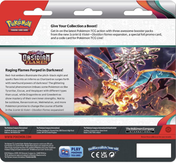 - This set includes 3 Pokémon TCG: Scarlet & Violet—Obsidian Flames booster packs (each booster pack contains 10 cards and 1 Basic Energy, with 3 guaranteed foil cards per booster.)