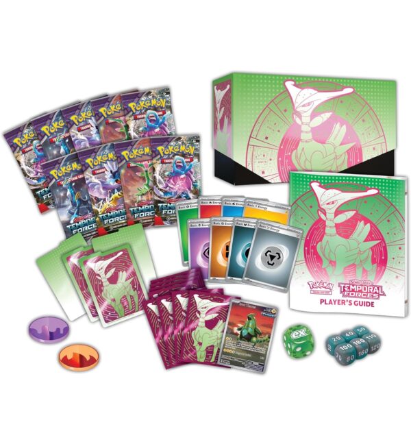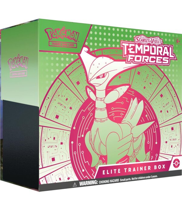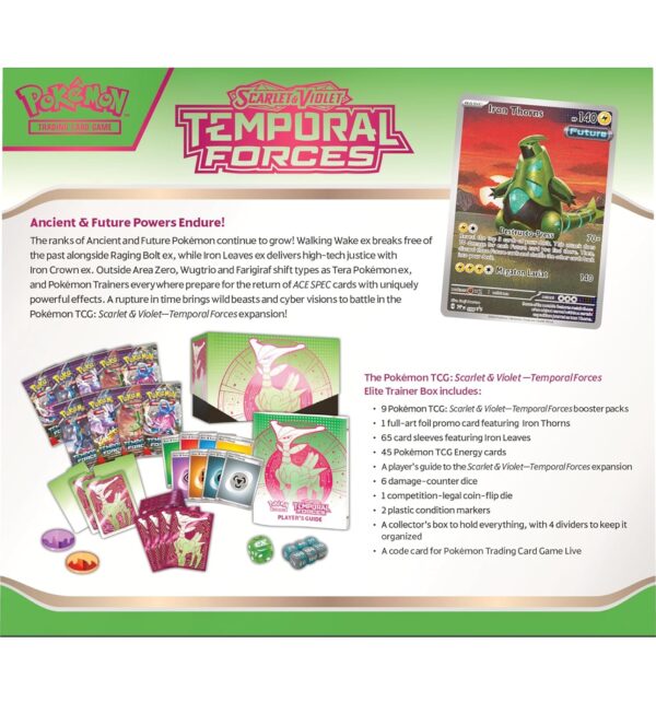 The ranks of Ancient and Future Pokémon continue to grow! Walking Wake ex breaks free of the past alongside Raging Bolt ex, while Iron Leaves ex delivers high-tech justice with Iron Crown ex. Outside Area Zero, Wugtrio and Farigiraf shift types as Tera Pokémon ex, and Pokémon Trainers everywhere prepare for the return of ACE SPEC cards with uniquely powerful effects. A rupture in time brings wild beasts and cyber visions to battle in the Scarlet & Violet—Temporal Forces expansion!