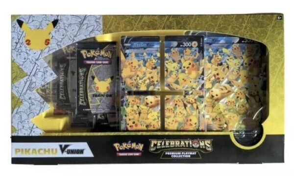 Celebrate in a big way with new pikachu v union: a single powerful pokemon divinded into four cards! You’ll have to use your wits and skill to get this particular pikachu into battle (with the help of professor burnet), but once you do it, you’ll be ready to let loose with one of four awesome attacks! This premium collection also brings you a hanc of pokemon tcg: celebrations booster packs and a fantastic playmat with plenty of room to assemble your star player. Are you ready for the challenge, trainer?