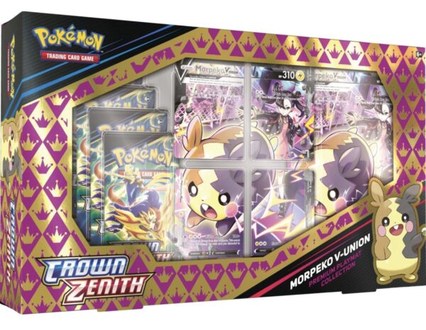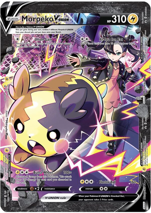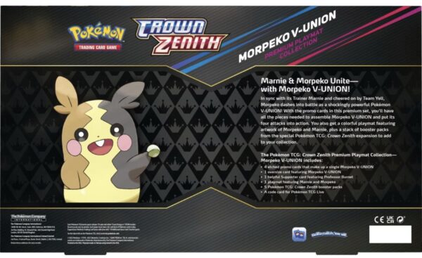 In sync with its Trainer Marnie and cheered on by Team Yell, Morpeko dashes into battle as a shockingly powerful Pokémon V-UNION! With the promo cards in this premium set, you’ll have all the pieces needed to assemble Morpeko V-UNION and put its four attacks into action. You also get a colorful playmat featuring artwork of Morpeko and Marnie, plus a stack of booster packs from the special Pokémon TCG: Crown Zenith expansion to add to your collection.