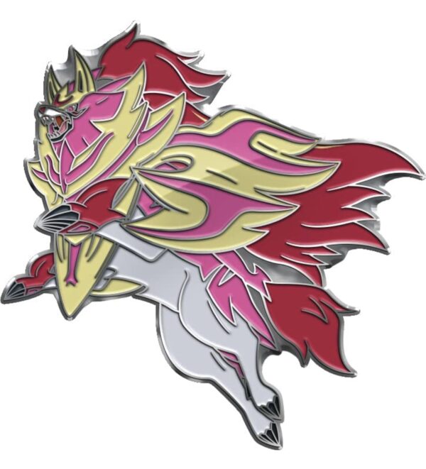 - In this box you will get 1 etched foil promo card featuring Shiny Zamazenta V, 1 sculpted figure featuring Shiny Zamazenta, 1 collector’s pin featuring Shiny Zamazenta and 65 card sleeves featuring both Shiny Zamazenta and Shiny Zacian.