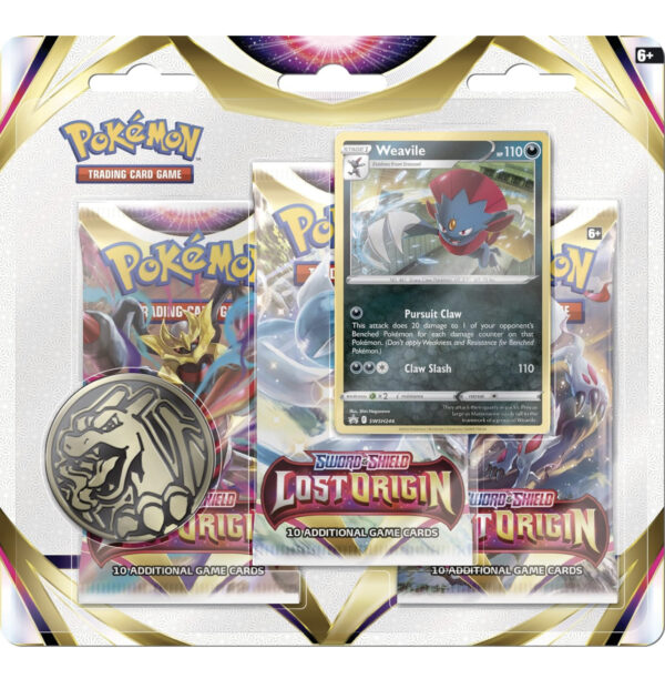 • This set includes 3 Sword & Shield – Lost Origin booster packs, a promo card with Weavile, a cool Pokémon coin (design may vary) to add to your collection and a code card for Pokémon TCG Live.