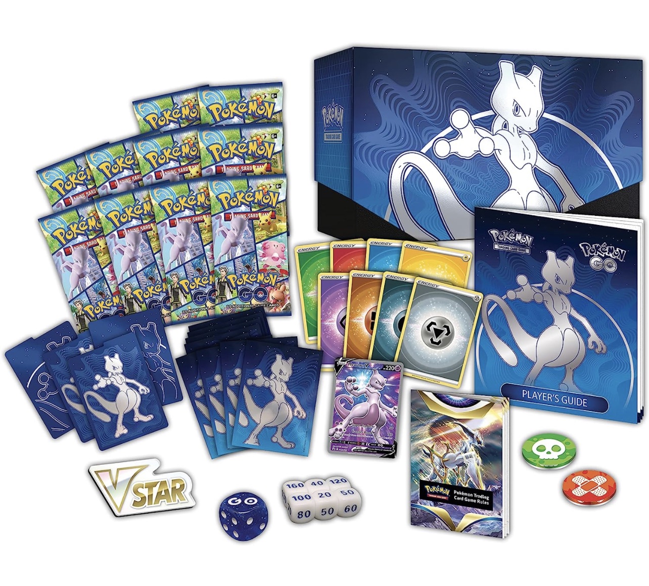 - You’ll also get 65 card sleeves featuring Mewtwo to keep your deck in good condition, 45 Energy cards to power up your team, damage-counter dice and a coin-flip die, acrylic condition and VSTAR markers, and a player’s guide to the Pokémon GO expansion.