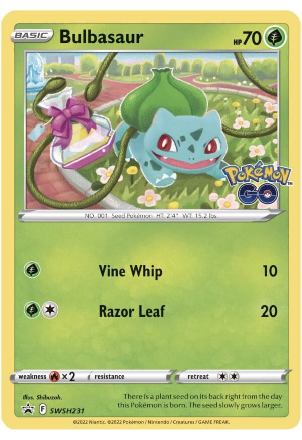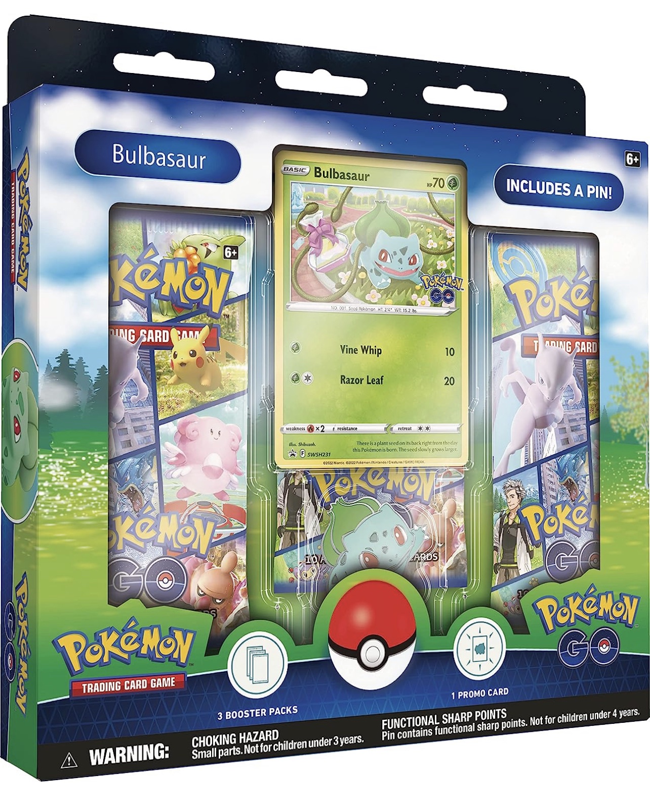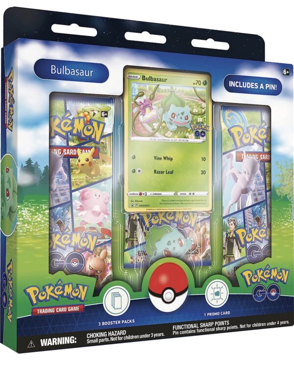 - Includes: 1 foil promo card featuring Bulbasaur, a collector’s pin featuring Bulbasaur and 3 Pokémon TCG: Pokémon GO booster packs.